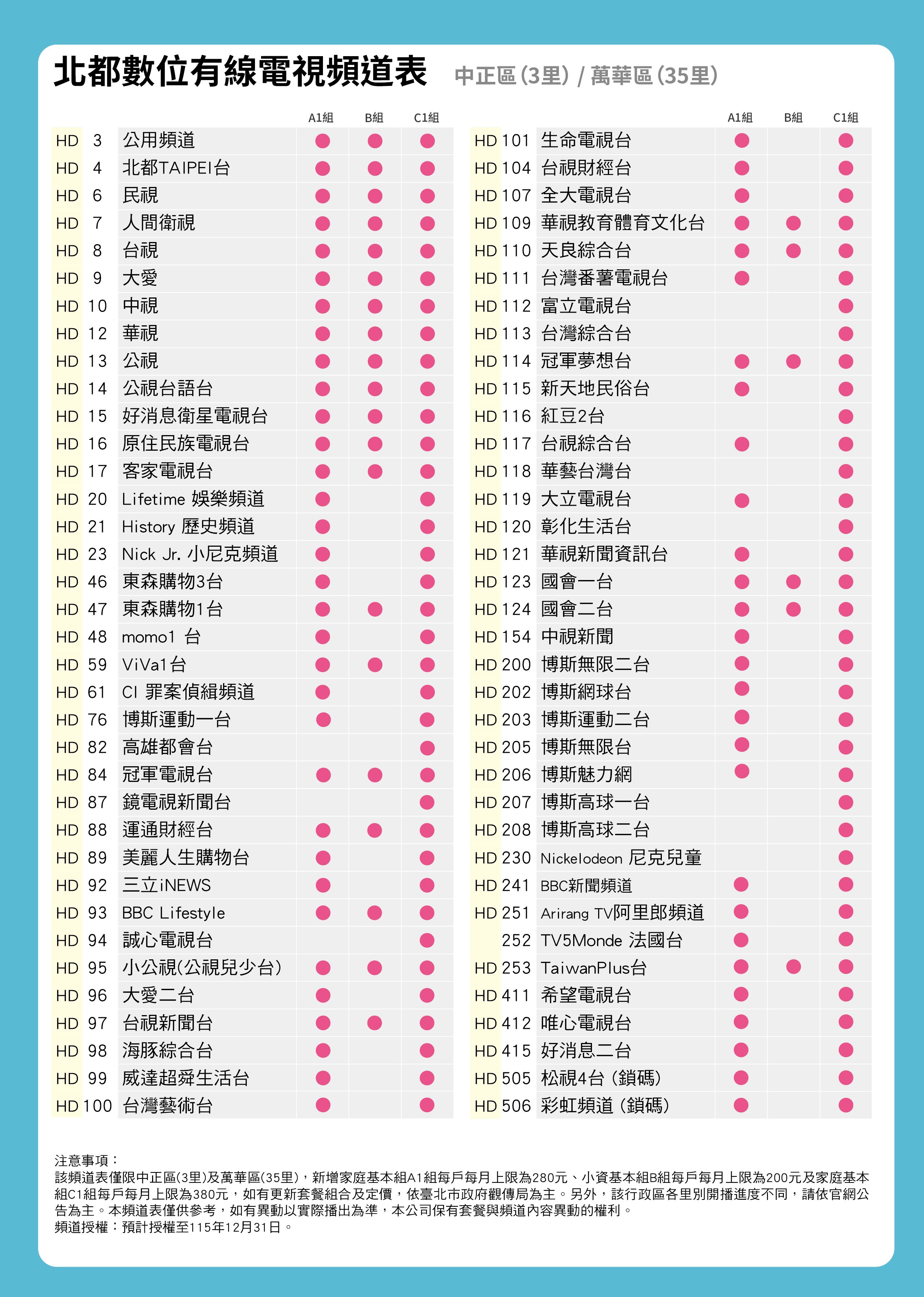 本公司113年7月至12月提供予中正區、萬華區等38里有線電視基本頻道A1、B、C1組收視費用如下:(一)基本頻道A1組(家庭基本組A1組)每月每戶收視費用上限280元。(二)基本頻道 B 組每月每戶收視費用上限200元。(三)基本頻道C1組(家庭基本組C1組)每月每戶收視費用上限380元。